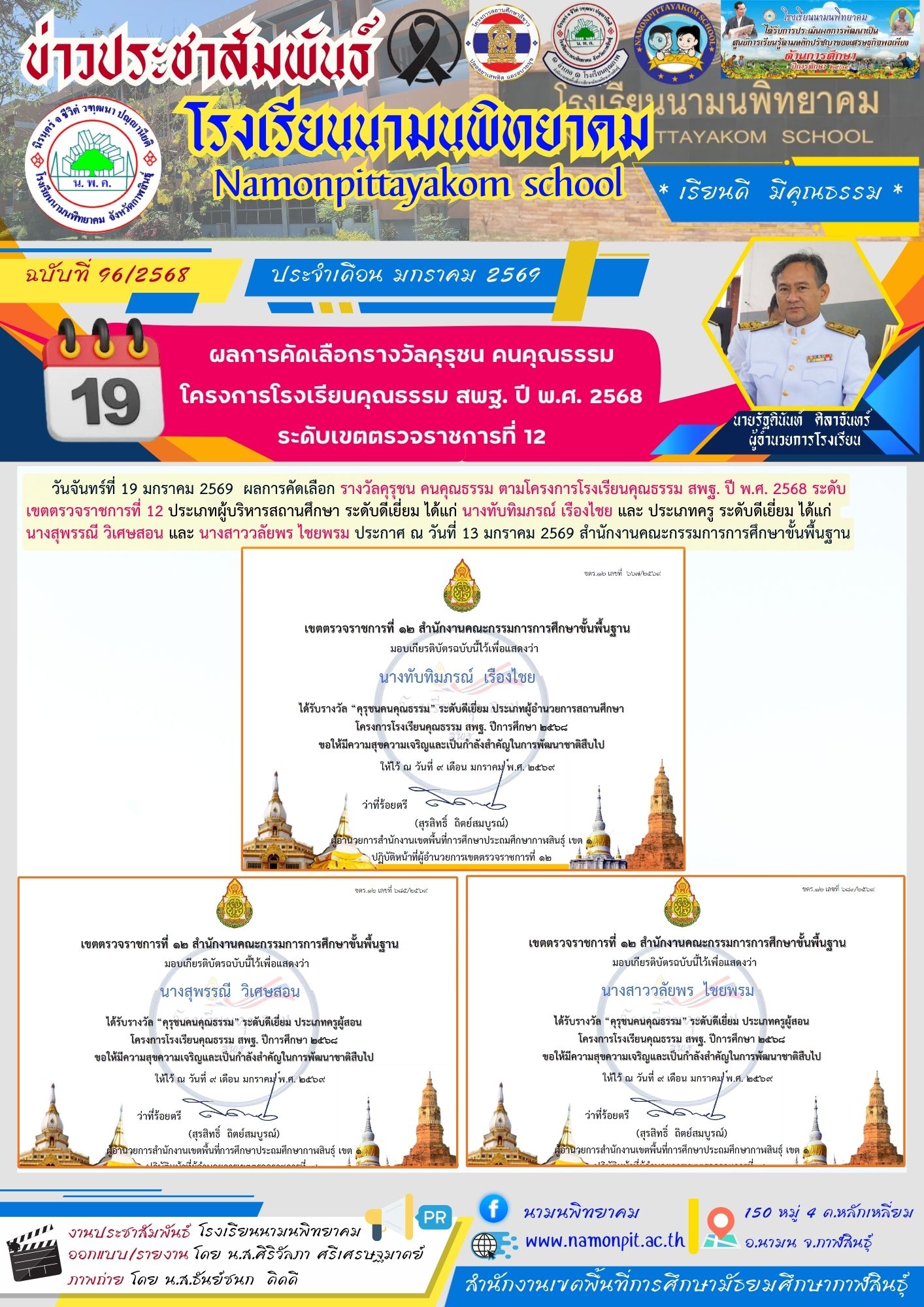 ผลการคัดเลือกรางวัลคุรุชน คนคุณธรรม โครงการโรงเรียนคุณธรรม สพฐ. ปี พ.ศ. 2568 ระดับเขตตรวจราชการที่ 12 มกราคม 19, 2026 นามนพิทยาคม Uncategorized