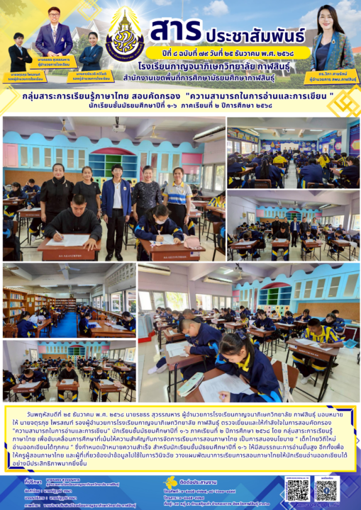 วันพฤหัสบดีที่ ๒๕ ธันวาคม พ.ศ. ๒๕๖๘ นายรชธร สุวรรณหาร ผู้อำนวยการโรงเรียนกาญจนาภิเษกวิทยาลัย กาฬสินธุ์ มอบหมายให้ นายจตุรภุช ไพรสณฑ์ รองผู้อำนวยการโรงเรียนกาญจนาภิเษกวิทยาลัย กาฬสินธุ์ ตรวจเยี่ยมและให้กำลังใจในการสอบคัดกรอง “ความสามารถในการอ่านและการเขียน” นักเรียนชั้นมัธยมศึกษาปีที่ ๑-๖ ภาคเรียนที่ ๒ ปีการศึกษา ๒๕๖๘ โดย กลุ่มสาระการเรียนรู้ภาษาไทย เพื่อขับเคลื่อนการศึกษาที่เน้นให้ความสำคัญกับการจัดการเรียนการสอนภาษาไทย เป็นการสนองนโยบาย “ เด็กไทยวิถีใหม่ อ่านออกเขียนได้ทุกคน ” ซึ่งกำหนดเป้าหมายความสำเร็จ สำหรับนักเรียนชั้นมัธยมศึกษาปีที่ ๑-๖ ให้มีสมรรถนะการอ่านขั้นสูง อีกทั้งเพื่อให้ครูผู้สอนภาษาไทย และผู้ที่เกี่ยวข้องนำข้อมูลไปใช้ในการวินิจฉัย วางแผนพัฒนาการเรียนการสอนภาษาไทยให้นักเรียนอ่านออกเขียนได้อย่างมีประสิทธิภาพมากยิ่งขึ้น