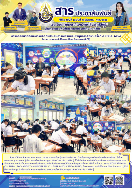 วันเสาร์ ที่ ๓๐ สิงหาคม พ.ศ. ๒๕๖๘ กลุ่มสาระการเรียนรู้ภาษาต่างประเทศ โรงเรียนกาญจนาภิเษกวิทยาลัย กาฬสินธุ์ นำโดย นายรชธร สุวรรณหาร ผู้อำนวยการโรงเรียนกาญจนาภิเษกวิทยาลัย กาฬสินธุ์ ได้นำนักเรียนระดับชั้นมัธยมศึกษาตอนต้นและตอนปลาย จำนวน ๓๗ คน เข้าร่วมการทดสอบวัดทักษะความคิดกับประสบการณ์ชีวิตและชิงทุนการศึกษา ครั้งที่ ๙ ปี พ.ศ. ๒๕๖๘ (Education & cultural exchange thai universal culture & educstion fund) โครงการเยาวชนอีซีอีแลกเปลี่ยนวัฒนธรรม (ECE) ประเทศอังกฤษ นิวซีแลนด์ และออสเตรเลีย ณ สนามสอบโรงเรียนกาญจนาภิเษกวิทยาลัย กาฬสินธุ์