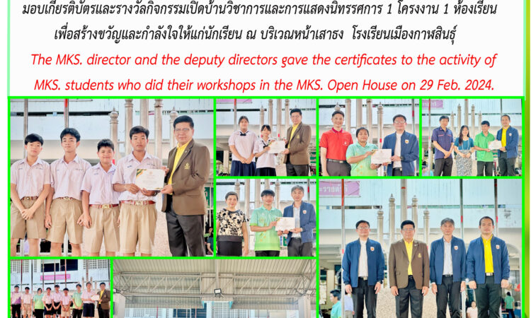 นายชูชัย ประทุมขันธ์ ผอ.รร. พร้อม รอง ผอ.รร มอบเกียรติบัตรและรางวัลกิจกรรมเปิดบ้านวิชาการแก่นักเรียนโรงเรียนเมืองกาฬสินธุ์ มีนาคม 6, 2024 เมืองกาฬสินธุ์ ข่าวสารโรงเรียนในสังกัด
