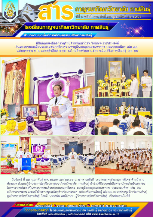 โรงเรีบนกาญจนาภิเษกวิทยาลัย กาฬสินธุ์ เข้าร่วมพิธีมอบหนังสือสารานุไทยสำหรับเยาวชนโดยพระราชประสงค์ในพระบาทสมเด็จพระบรมชนกาธิเบศร มหาภูมิพลอดุลยเดชมหาราช บรมนาถบพิตร เล่ม ๔๓ ฉบับพระราชทาน และหนังสือสารานุกรมไทยสำหรับเยาวชนฯ ฉบับเสริมการเรียนรู้ เล่ม ๒๒