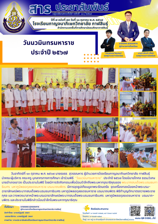 โรงเรียนกาญจนาภิเษกวิทยาลัย กาฬสินธุ์ “วันนวมินทรมหาราช” ประจำปี ๒๕๖๗ ตุลาคม 13, 2024 โรงเรียนกาญจนาภิเษกวิทยาลัย กาฬสินธุ์ ข่าวสารโรงเรียนในสังกัด