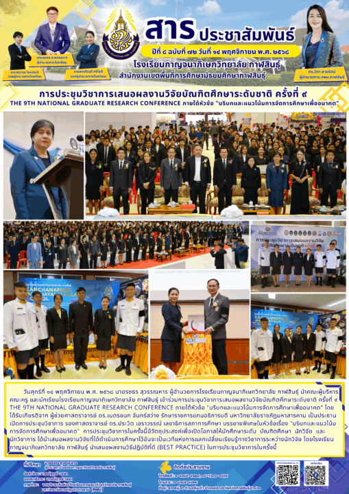 วันศุกร์ที่ ๑๔ พฤศจิกายน พ.ศ. ๒๕๖๘ นายรชธร สุวรรณหาร ผู้อำนวยการโรงเรียนกาญจนาภิเษกวิทยาลัย กาฬสินธุ์ นำคณะผู้บริหาร คณะครู และนักเรียนโรงเรียนกาญจนาภิเษกวิทยาลัย กาฬสินธุ์ เข้าร่วมการประชุมวิชาการเสนอผลงานวิจัยบัณฑิตศึกษาระดับชาติ ครั้งที่ ๙ The 9th National Graduate Research Conference ภายใต้หัวข้อ “บริบทและแนวโน้มการจัดการศึกษาเพื่ออนาคต” โดยได้รับเกียรติจาก ผู้ช่วยศาสตราจารย์ ดร.เนตรชนก จันทร์สว่าง รักษาราชการแทนอธิการบดี มหาวิทยาลัยราชภัฏมหาสารคาม เป็นประธานเปิดการประชุมวิชาการ รองศาสตราจารย์ ดร.ประวิต เอราวรรณ์ เลขาธิการสภาการศึกษา บรรยายพิเศษในหัวข้อเรื่อง “บริบทและแนวโน้มการจัดการศึกษาเพื่ออนาคต” การประชุมวิชาการในครั้งนี้มีวัตถุประสงค์เพื่อเปิดโอกาสให้นักศึกษาระดับ บัณฑิตศึกษา นักวิจัย และนักวิชาการ ได้นำเสนอผลงานวิจัยที่ได้ดำเนินการศึกษาไว้อันจะเป็นเวทีแห่งการแลกเปลี่ยนเรียนรู้ทางวิชาการระหว่างนักวิจัย คณาจารย์ และ ผู้ที่สนใจ ตลอดจนเป็นการส่งเสริมให้เกิดการพัฒนาองค์ความรู้ใหม่ ที่สามารถนำไปต่อยอดและประยุกต์ใช้ในการพัฒนาประเทศอย่างยั่งยืน โดยโรงเรียนกาญจนาภิเษกวิทยาลัย กาฬสินธุ์ นำเสนอผลงานวิธีปฏิบัติที่ดี (Best practice) ในการประชุมวิชาการในครั้งนี้