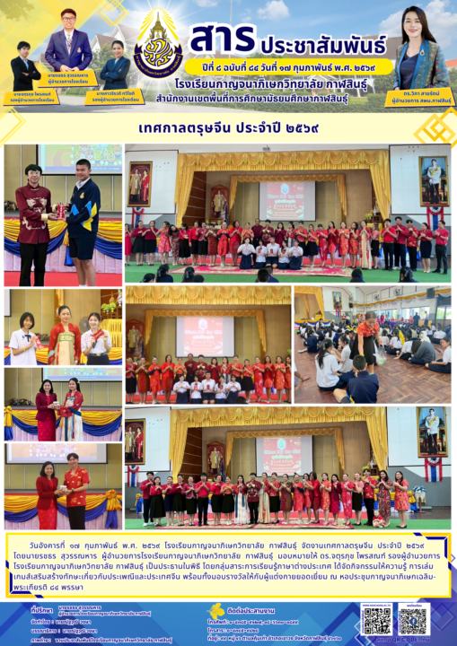 วันอังคารที่ ๑๗ กุมภาพันธ์ พ.ศ. ๒๕๖๙ โรงเรียนกาญจนาภิเษกวิทยาลัย กาฬสินธุ์ จัดงานเทศกาลตรุษจีน ประจำปี ๒๕๖๙ โดยนายรชธร สุวรรณหาร ผู้อำนวยการโรงเรียนกาญจนาภิเษกวิทยาลัย กาฬสินธุ์ มอบหมายให้ ดร.จตุรภุช ไพรสณฑ์ รองผู้อำนวยการโรงเรียนกาญจนาภิเษกวิทยาลัย กาฬสินธุ์ เป็นประธานในพิธี โดยกลุ่มสาระการเรียนรู้ภาษาต่างประเทศ ได้จัดกิจกรรมให้ความรู้ การเล่มเกมส์เสริมสร้างทักษะเกี่ยวกับประเพณีและประเทศจีน พร้อมทั้งมอบรางวัลให้กับผู้แต่งกายยอดเยี่ยม ณ หอประชุมกาญจนาภิเษกเฉลิมพระเกียรติ ๘๔ พรรษา