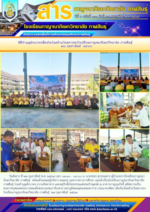 โรงเรียนกาญจนาภิเษกวิทยาลัย กาฬสินธุ์ จัดพิธีทำบุญตักบาตรเนื่องในวะนคล้ายวันสถาปนาโรงเรียนกาญจนาภิเษกวิทยาลัย กาฬสินธุ์ ๒๗ กุมภาพันธ์ ๒๕๖๗