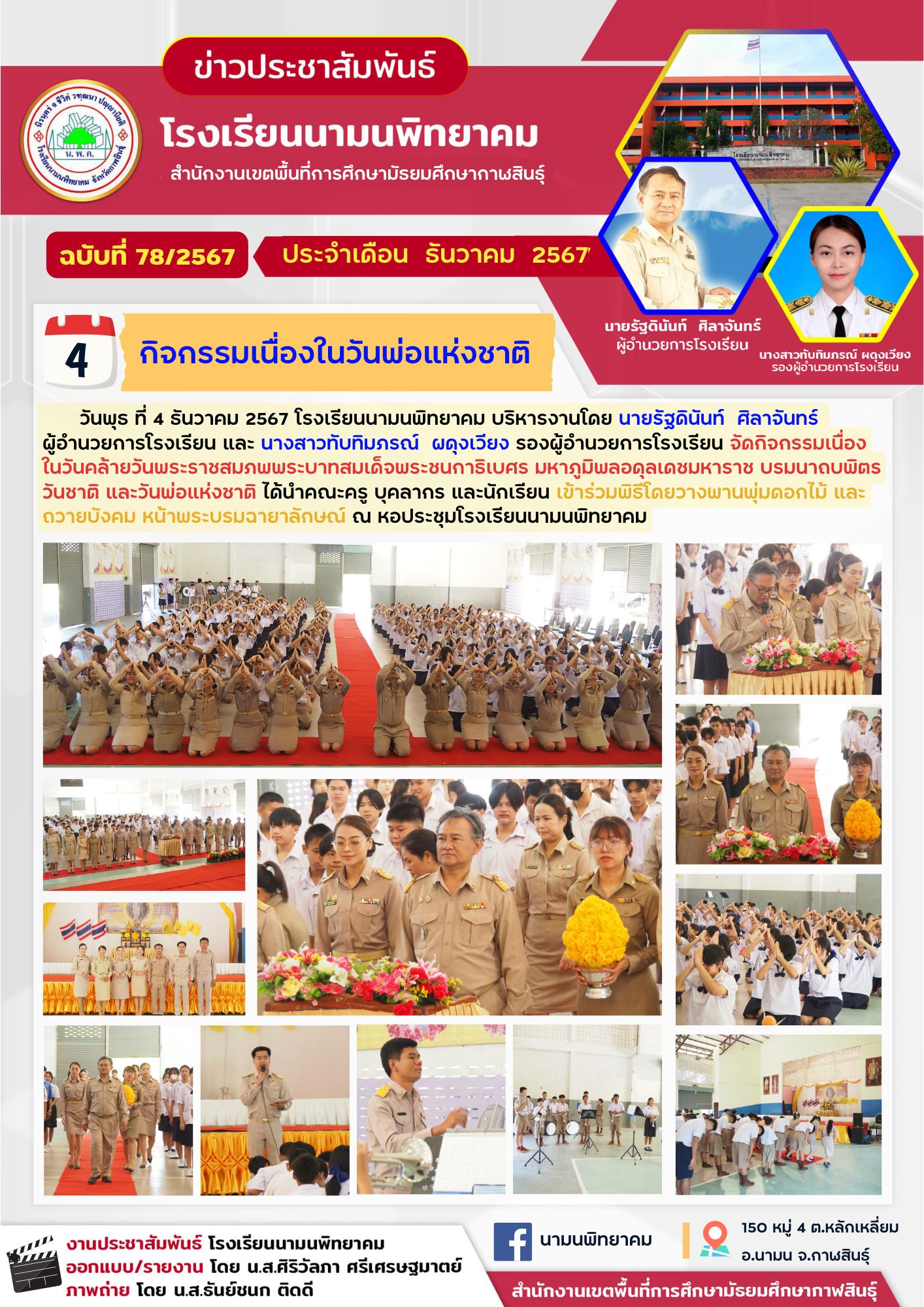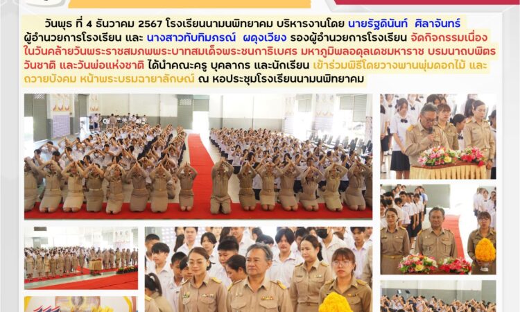 โรงเรียนนามนพิทยาคม จัดกิจกรรมเนื่องในวันคล้ายวันพระราชสมภพพระบาทสมเด็จพระชนกาธิเบศร มหาภูมิพลอดุลเดชมหาราช บรมนาถบพิตร วันชาติ และวันพ่อแห่งชาติ