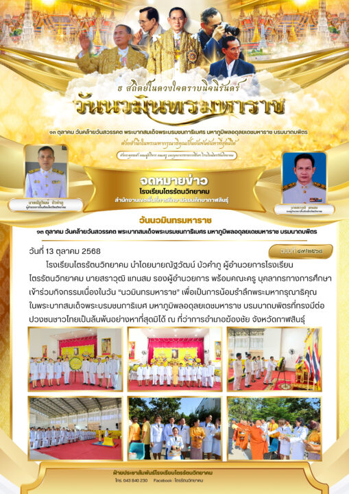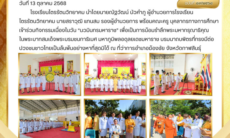 โรงเรียนไตรรัตนวิทยาคม เข้าร่วมกิจกรรมเนื่องใน “วันนวมินทรมหาราช” ณ ที่ว่าการอำเภอฆ้องชัย จังหวัดกาฬสินธุ์ ตุลาคม 14, 2025 ไตรรัตนวิทยาคม ข่าวสารโรงเรียนในสังกัด