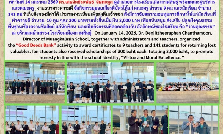 Muangkalasin School Honors Teachers and Students for Honesty through the “Good Deeds Bank” Activity มกราคม 14, 2026 เมืองกาฬสินธุ์ ข่าวสารโรงเรียนในสังกัด