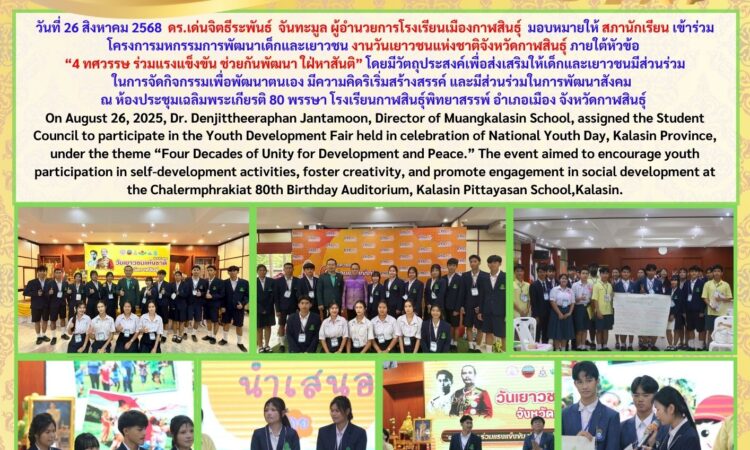Muangkalasin School Student Council joined the National Youth Day 2025 inkalasin under the theme “Four Decades of Unity for Development and Peace” at Kalasin Pittayasan School. สิงหาคม 29, 2025 เมืองกาฬสินธุ์ ข่าวสารโรงเรียนในสังกัด