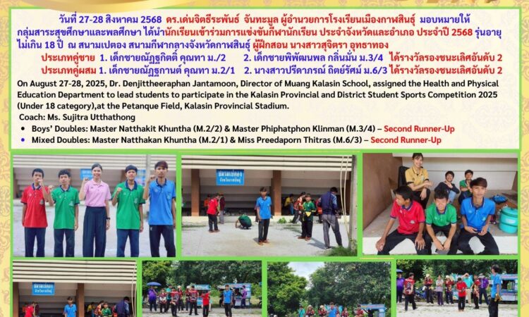 Muangkalasin School Students Win Second Runner-Up Prizes at Kalasin Provincial Student Sports Competition 2025 สิงหาคม 29, 2025 เมืองกาฬสินธุ์ ข่าวสารโรงเรียนในสังกัด